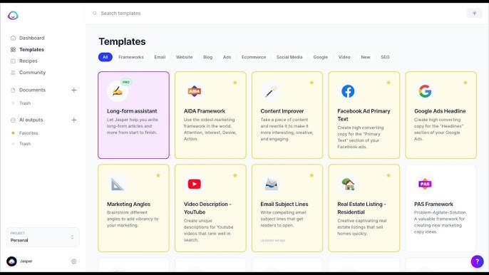 Jasper AI, formerly Jarvis, is purpose-built for marketers, bloggers, and businesses that rely on content. It includes a wide range of templates, tones, and workflows aimed at streamlining content creation.