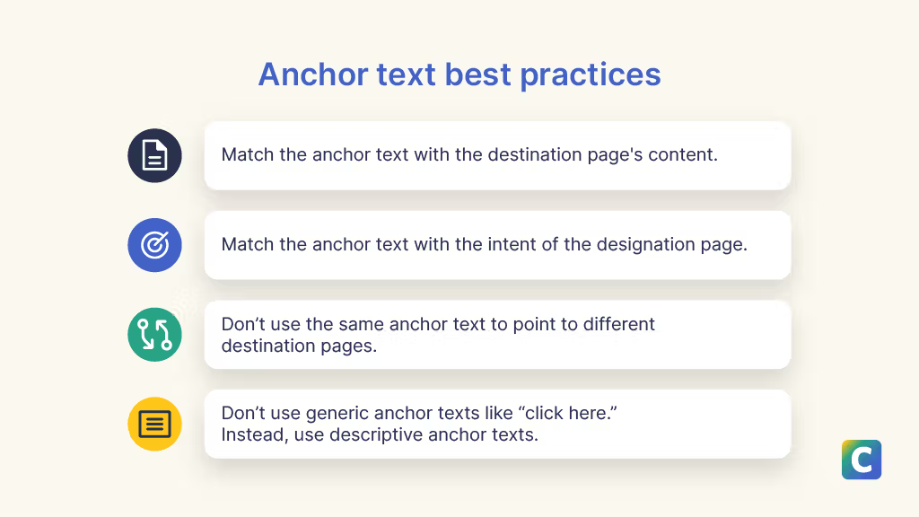 Avoid using the same exact anchor text for every link—it can appear spammy to search engines.